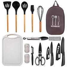 캠핑용 버너(3,000원), 스테인리스 쿠커세트(2,000원), 접이식 컵(1,000원), 다용도 집게(2,000원)로 기본 요리는 모두 해결 가능합니다.